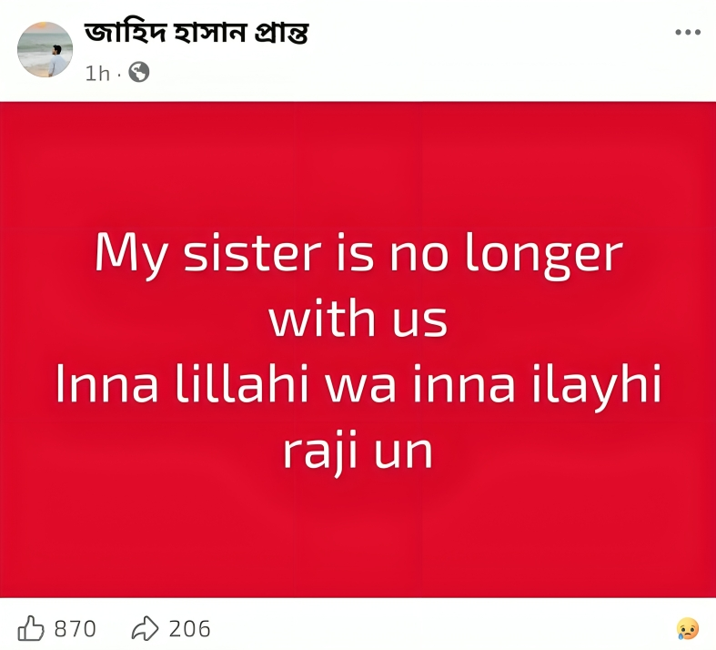 স্থানীয় আইনশৃঙ্খলা বাহিনী জানায়, ফ্লোরিডার ট্যাম্পা এলাকার একটি সেতুর কাছ থেকে তাঁর মরদেহ উদ্ধার করা হয়। এ ঘটনায় সন্দেহভাজন হিসেবে তাঁর রুমমেট হিশাম সালেহ আবুঘরবেহ-কে গ্রেপ্তার করা হয়েছে এবং তাকে জিজ্ঞাসাবাদ চলছে। এ বিষয়ে বাংলাদেশ কনস্যুলেটসহ সংশ্লিষ্ট কর্তৃপক্ষকে অবহিত করা হয়েছে। তদন্ত শেষে বিস্তারিত তথ্য প্রকাশ করা হবে বলে জানিয়েছে পুলিশ।
